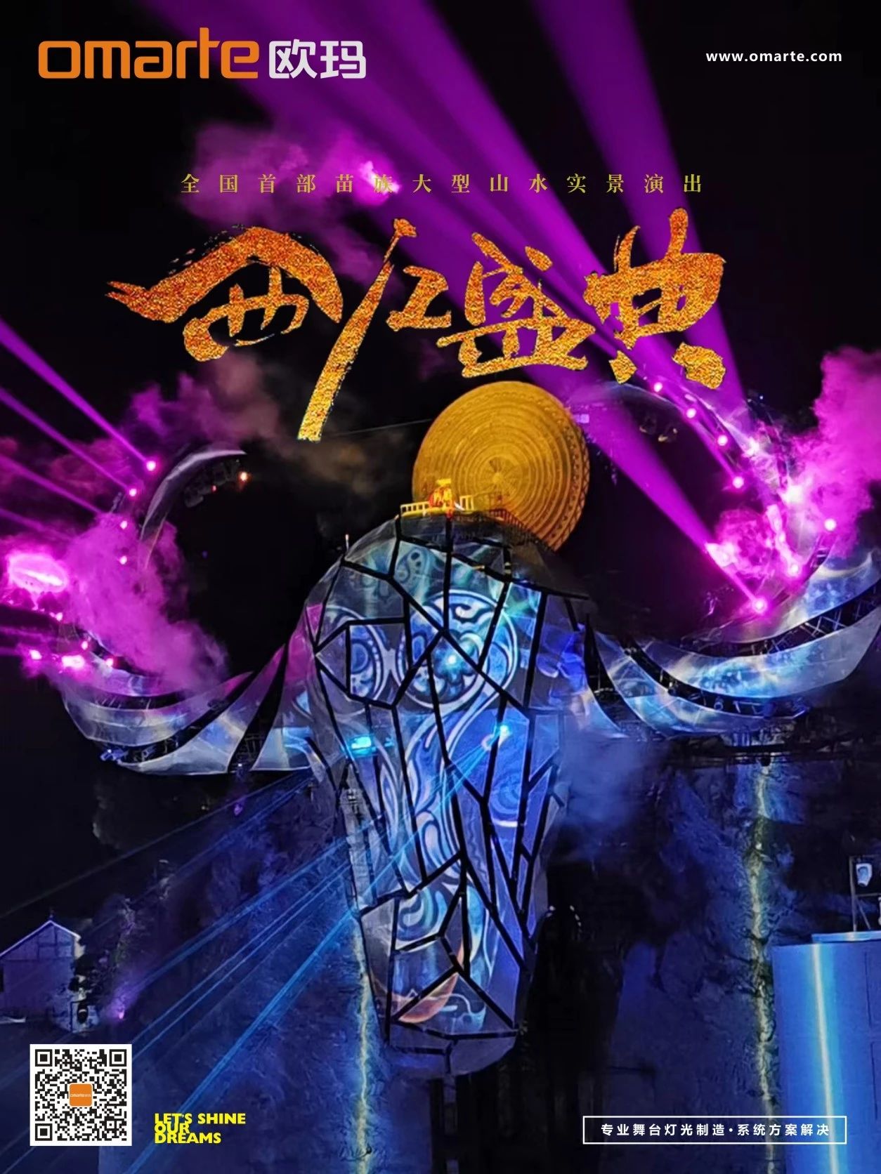 數千臺OMARTE歐瑪燈具綻放出無限絢麗的色彩,每個燈具的使用都經過了嚴格的測量和考慮,燈光的交錯排列豐富了舞臺的層次感,搭配卓越的舞臺特技、恢弘的音樂,多媒體等技術手段,藝術再現“序幕·頌、祖·英雄、魂·跋涉、夢·家園、尾聲·歌”五幕場景,詮釋了真摯而深重的苗族文化魅力,展示出一部苗族人民守護家園的氣勢磅礴的英雄史詩。