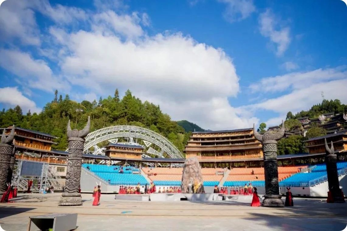 一部心史鑄魂魄,一曲長歌頌家園。《西江盛典》以山水實景苗族村落雞鳩苗寨為舞臺背景,以村民生產生活用品為舞臺道具,結合大塘景區的地貌山形,構成了舞臺劇場,真實再現了原生態。山體上,懸掛著的巨型牛頭;半山腰,一架紡織機,織出一條銀河之路散落山間;山腳下,聳立著壯觀的四面銅鼓群;村落中,遍布著25盞蓮花燈;清河邊的大水車旁,是有著600多年歷史的獨特建筑“水上糧倉”。