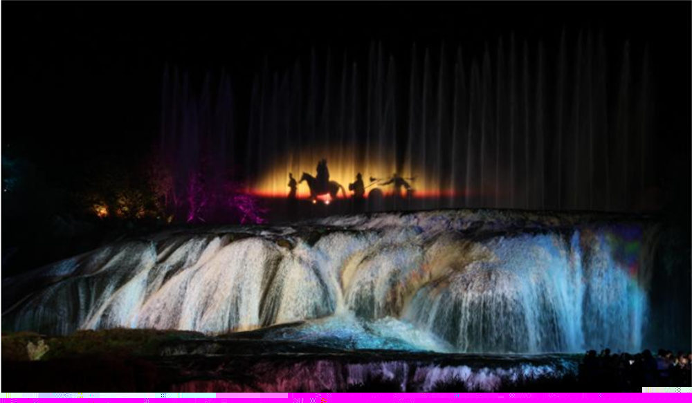 作為86版《西游記》片尾曲中師徒四人牽馬跋涉的取景地,陡坡塘瀑布承載著一代人的熒屏記憶。此次《再回西游》項目以瀑布為核心舞臺,依托山體、水幕、密林等自然景觀,結合全息投影、激光矩陣、霧森系統等前沿技術,將《西游記》中一系列經典片段逐一復刻。游客穿行于光影交織的山水之間,仿佛置身于神話與現實交錯的平行時空。