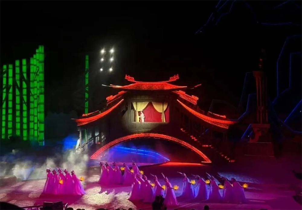 歐瑪燈光設備的卓越性能,完美實現了"移步換景"的沉浸式觀演體驗。當觀眾置身旋轉席間,燈光與山水實景交相輝映,傳統"舞臺"概念被徹底消解,取而代之的是"人在畫中行,劇在身邊生"的實景體驗。燈光與音樂的精準配合,更創造出"一鏡到底"的全景感官沖擊。