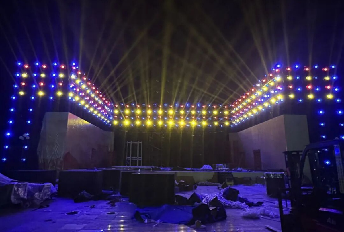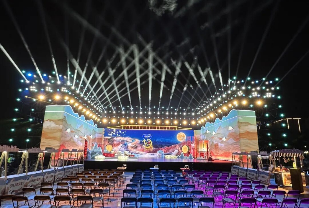而這場文化盛宴的舞臺光彩,全由新疆大唐盛業聯合歐瑪燈光打造——近500臺歐瑪旗艦設備強勢助陣,其中防水光束燈以精準銳利的光效劃破邊疆夜色,切割燈靈活勾勒出詩與舞臺的立體輪廓,LED染色燈則將“戈壁明珠”的璀璨與軍墾情懷的厚重鋪滿全場,讓千年詩韻與兵團精神在光影流轉中實現深度交融。