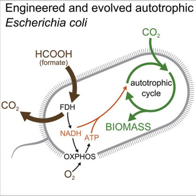 研究人員向大腸桿菌基因中添加一種轉化二氧化碳的酶,并且去除了用于代謝糖的其它酶,最終成功改變了它們賴以生存的“食物”來源。為了證明它們真的不需要糖來維持生存,科學家們把這些細菌放在實驗室里200天。當再次對這些細菌進行研究時,研究人員發現它們已經成功地”進化”了,而且能夠在不需要糖的情況下生長。