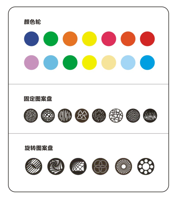 ?·?2個圖案盤,金屬圖案盤帶有8種固定金屬圖案,旋轉圖案盤帶有6種可更換的圖案片,圖案可定位、雙向旋轉、圖案流水,具有抖動效果